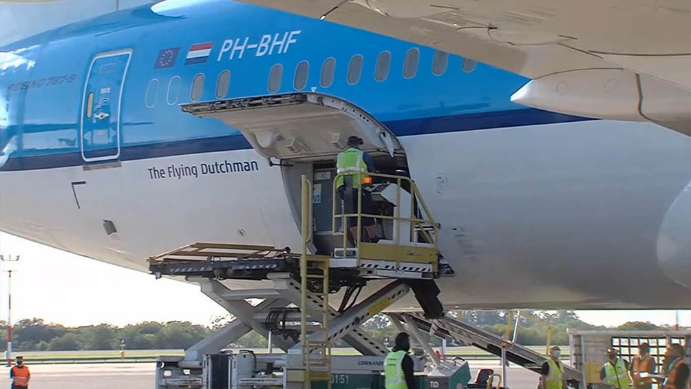 El vuelo de la aerolínea KLM con las 218.000 dosis de Oxford/AstraZeneca del Fondo Global de Acceso a las Vacunas contra la Covid-19 (Covax) aterrizó este domingo en el aeropuerto internacional de Ezeiza.