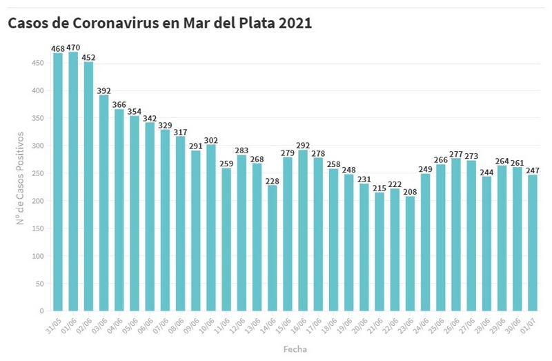 En el último informe del SISA, se confirmaron hoy 247 nuevos pacientes en tratamiento por Covid-19, de los cuales 32 corresponden a casos definidos por criterio clínico epidemiológico y 215 a estudios laboratoriales realizados desde el 17 al 30 de junio.