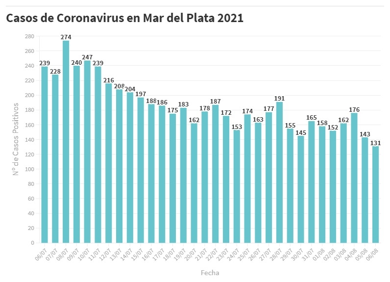 En el último informe del SISA presentado hoy, se confirmaron 131 nuevos pacientes en tratamiento por Covid-19 en General Pueyrredon, de los cuales 20 corresponden a casos definidos por criterio clínico epidemiológico y 111 a estudios laboratoriales realizados desde el 26 de julio al 5 de agosto.