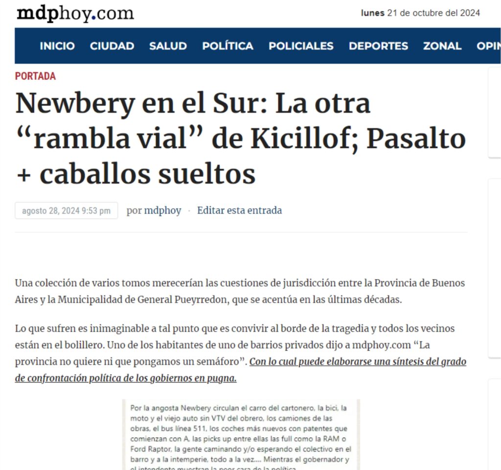 Jorge Newbery es una trampa mortal, barrios privados nuevos y en crecimiento, clubes deportivos de alta generación (tipo MLS), el complejo turístico más importante y completo de la ciudad, haras deportivos etc. Son sólo 6 kilómetros, desde Mario Bravo a la 515, pero que no adquieren la importancia de la judicialización de la administración de Punta Mogotes o la Rambla, por citar sólo 2 ejemplos, con dividendos políticos.