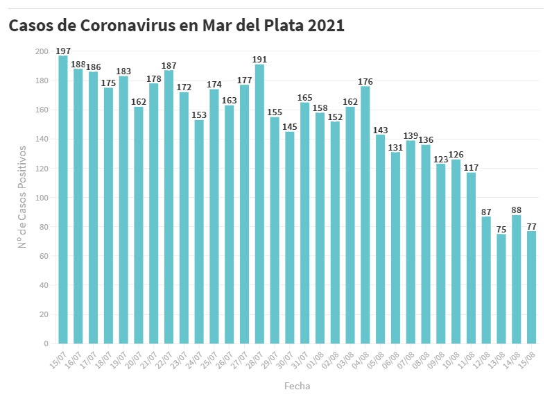 En el último informe del SISA reportado hoy se confirmaron 77 nuevos pacientes en tratamiento por Covid-19 en General Pueyrredon, de los cuales 11 corresponden a casos definidos por criterio clínico epidemiológico y 66 a estudios laboratoriales realizados desde el 5 al 14 de agosto.