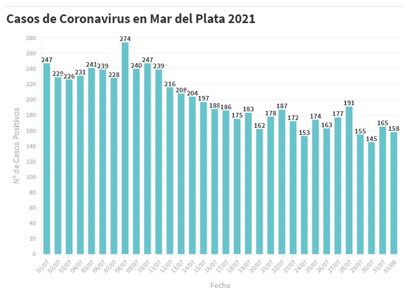 En el último informe del SISA reportado hoy, se confirmaron 158 nuevos pacientes en tratamiento por Covid-19 en Mar del Plata, de los cuales 17 corresponden a casos definidos por criterio clínico epidemiológico y 141 a estudios laboratoriales realizados desde el 23 al 31 de julio.