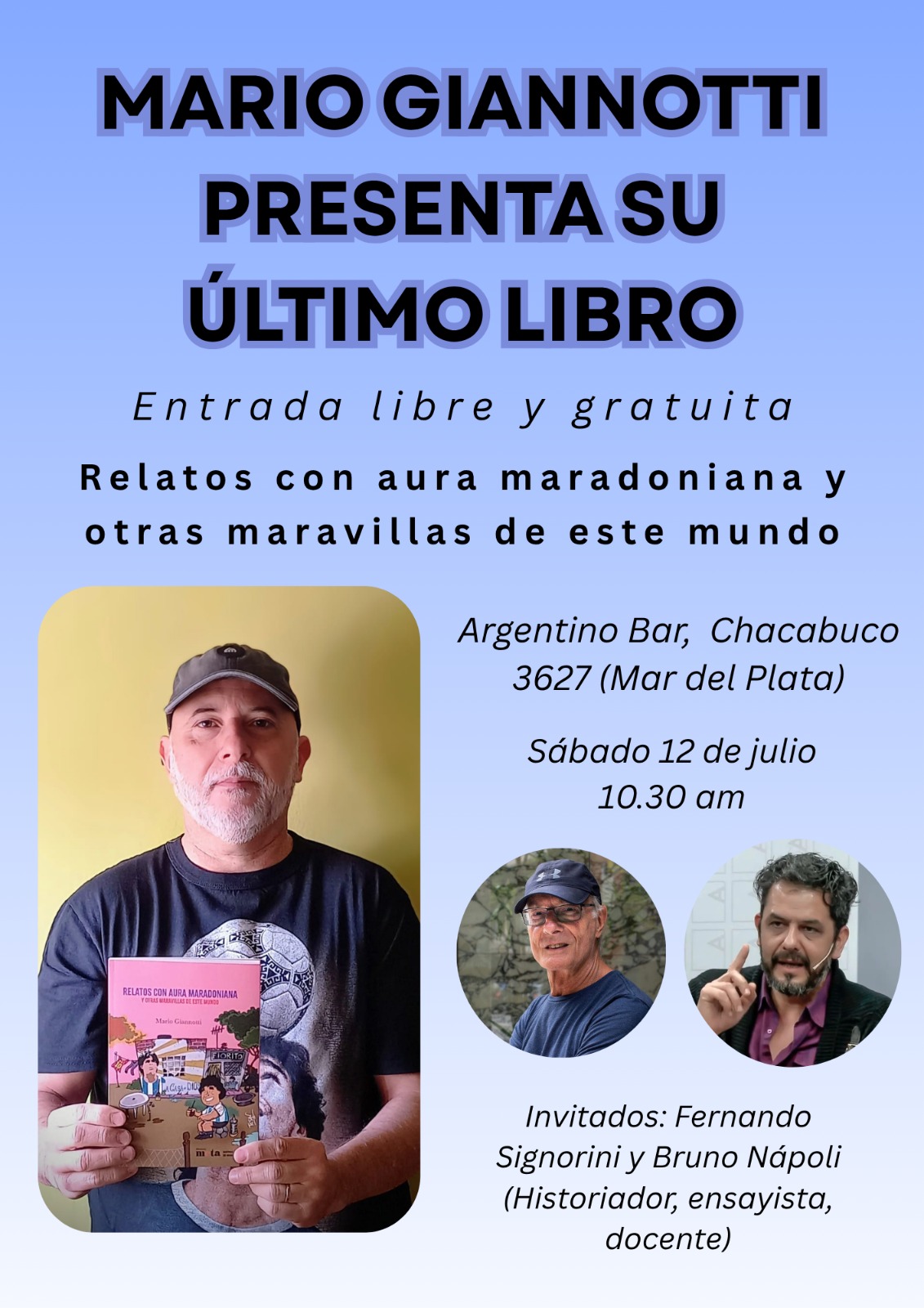 El periodista y escritor Mario Giannotti presentará este sábado 12 julio a las 10:30, en el mítico Argentino Bar, Chacabuco 3627, su último libro: “Relatos con aura maradoniana y otras maravillas de este mundo”.