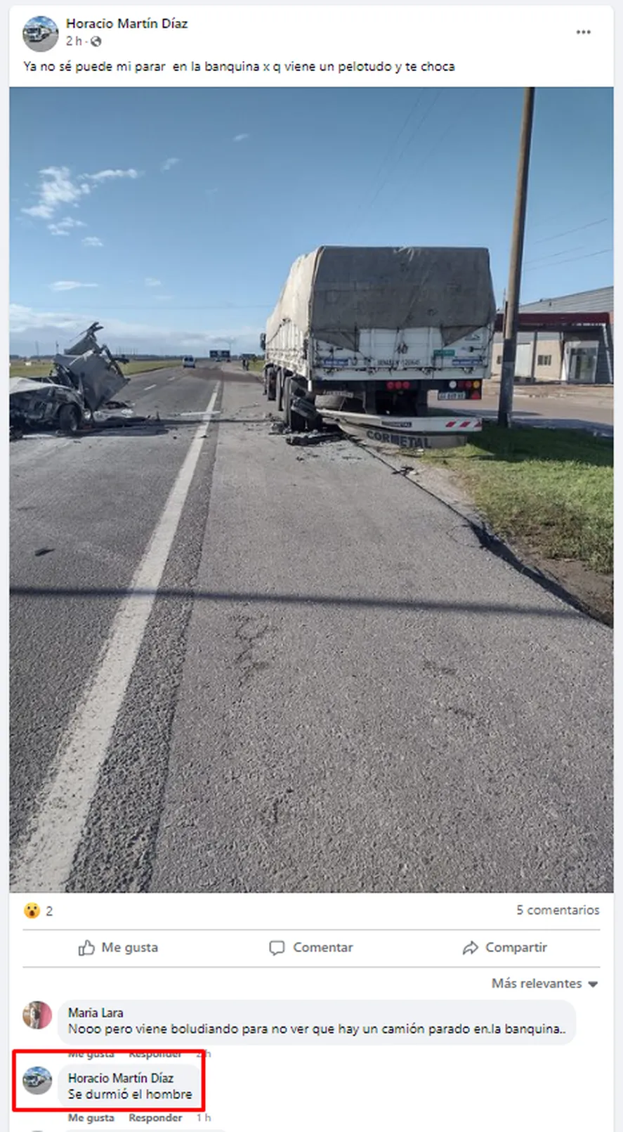 El camionero utilizó las redes sociales para expresar su bronca por el accidente. «Ya no se puede ni parar en la banquina porque viene un pelotudo y te choca», escribió en Facebook, mostrando una foto del accidente.
