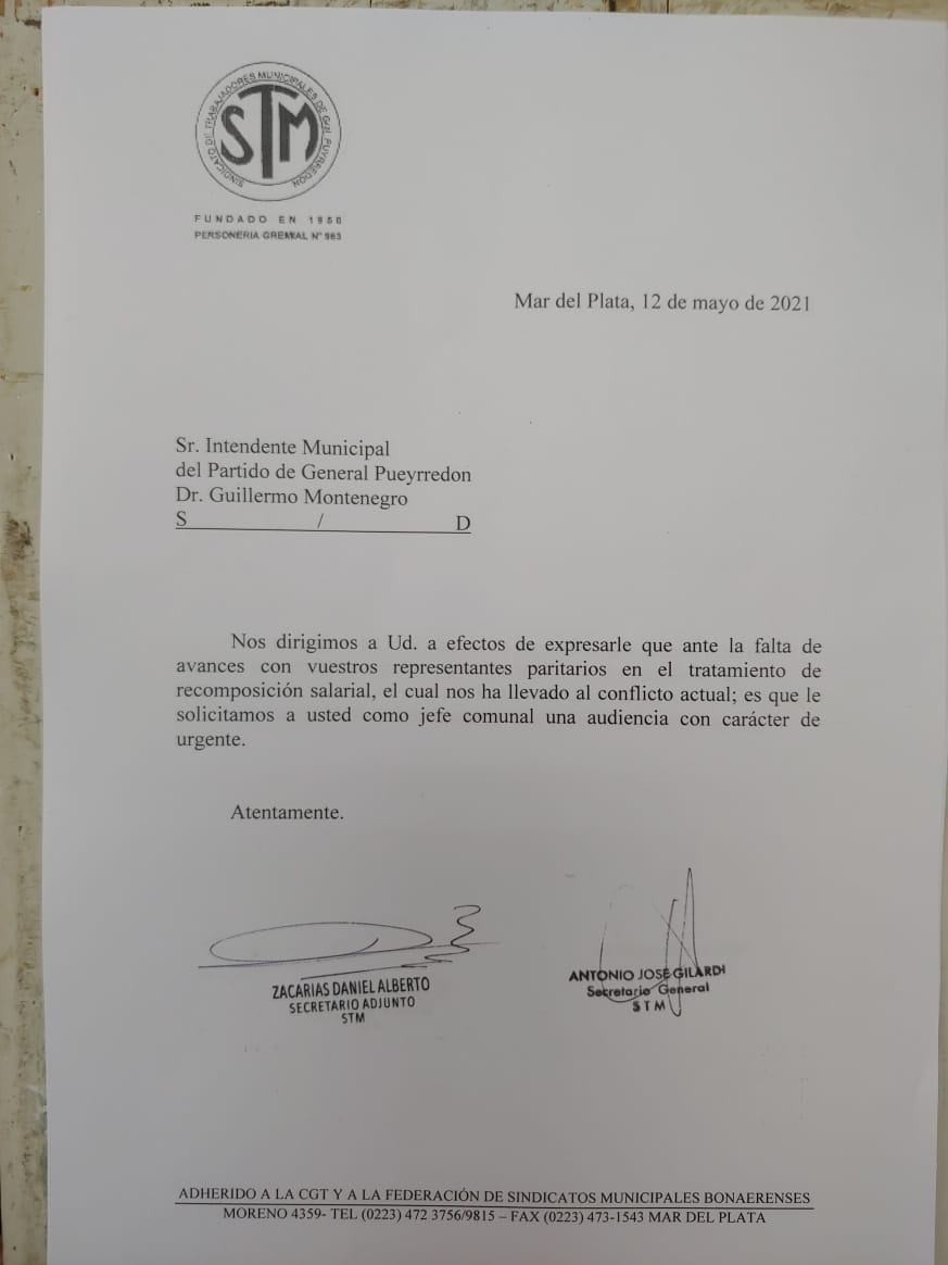 En este escenario el STM ha solicitado con carácter de urgente, una audiencia al intendente “para tratar la recomposición salarial” y ante la falta de avances con los representantes paritarios.