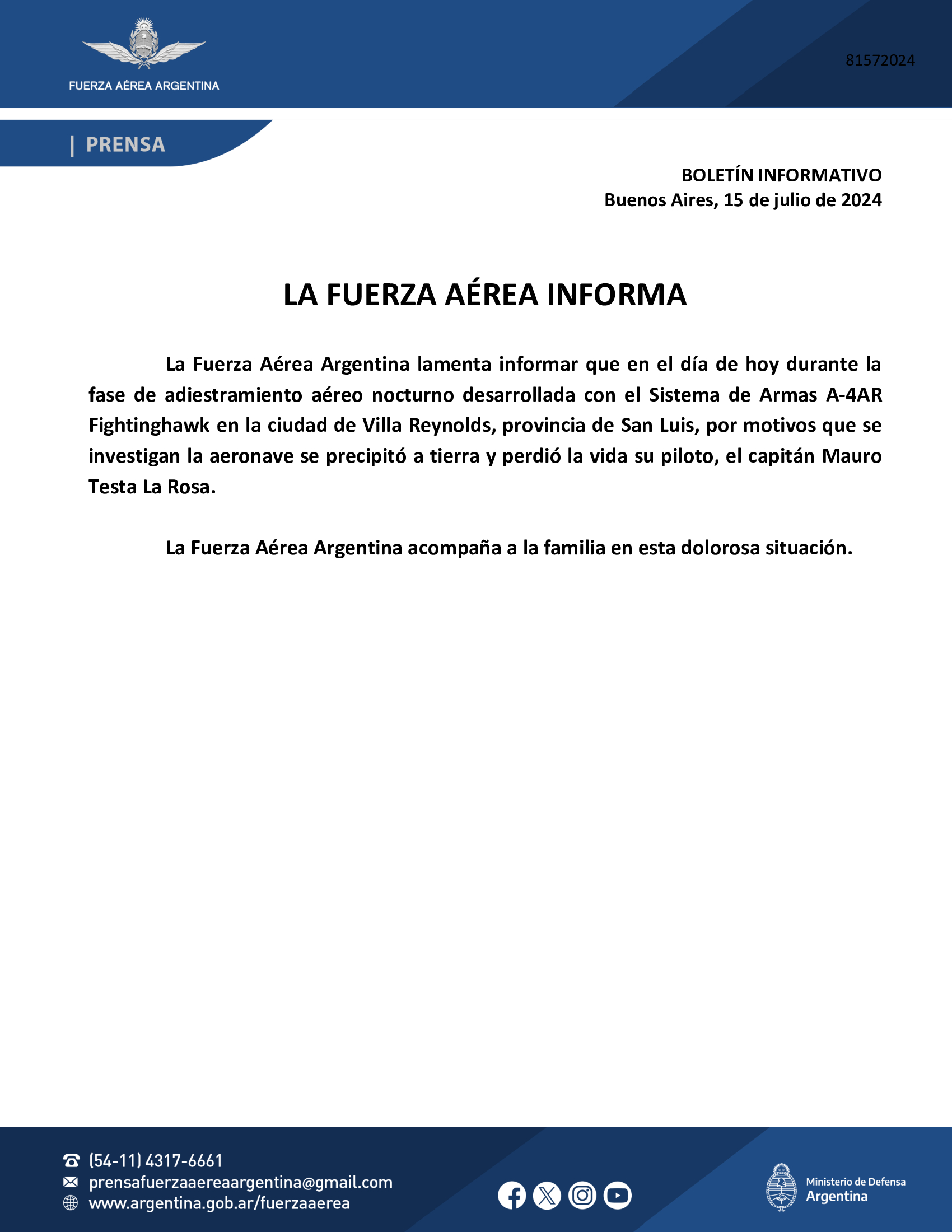 “Mauro Testa La Rosa era piloto de la Fuerza Aérea Argentina al servicio de la Patria. Hace unos días lo vimos con orgullo formar parte del desfile militar del 9 de Julio en Buenos Aires”, expresaron en un comunicado y remarcaron: “En este momento de inmenso dolor, agradecemos una oración por él y su familia”.