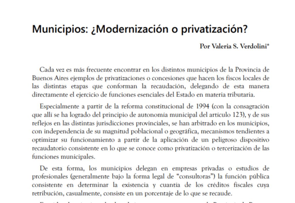 Sobre la tercerización de la recuperación de deudores morosos de tasas y derechos municipales se expidió Valeria Verdolini en un trabajo que lleva el título, Municipios ¿Modernización o privatización?