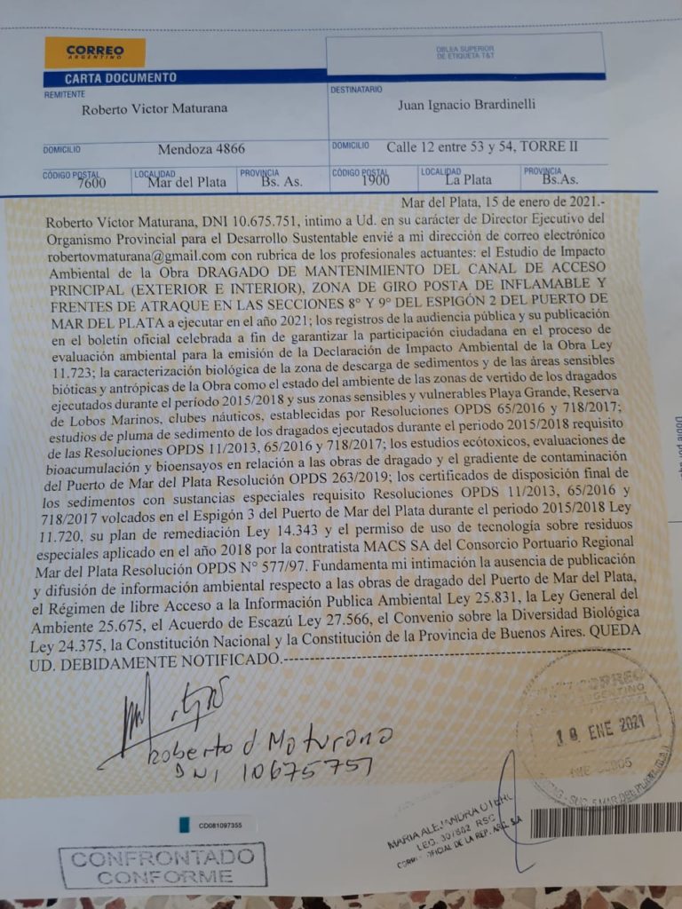 Si bien desde el Consorcio afirman que este fallo no pone en riesgo el plan de licitación para el dragado que se realizará este año, lo cierto es que Roberto Maturana envió el pasado 15 de enero una carta documento dirigida al Director Ejecutivo de OPDS, Juan Ignacio Brardinelli, solicitándole que le envíe a su correo electrónico “el Estudio de Impacto Ambiental de la obra Dragado del Puerto de Mar del Plata a ejecutar en el año 2021”, como así también “los registros de Audiencia Pública y su publicación en el Boletín Oficial, la Declaración de Impacto Ambiental, y la caracterización biológica de la zona de descarga de sedimentos”, entre otras cosas.