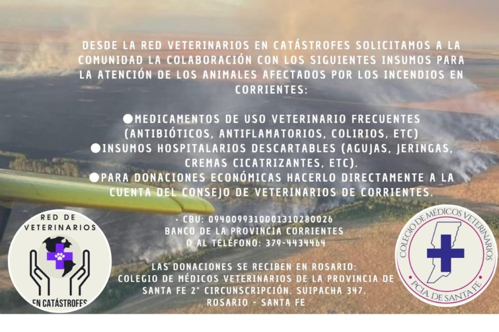 Desde la Red Veterinarios en Catástrofes solicitamos a la comunidad la colaboración con los siguientes insumos para la atención de los animales afectados por los incendios en Corrientes: