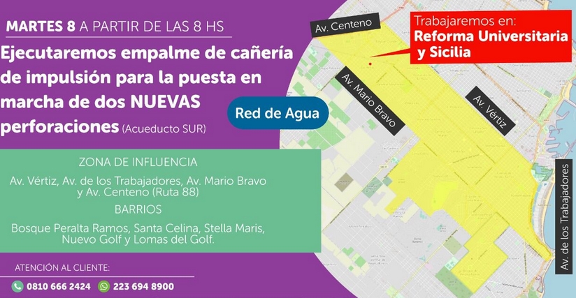 Desde Obras Sanitarias Sociedad de Estado (OSSE) anunciaron que mañana desde las 08:00 se estará desarrollando una obra en Reforma Universitaria y Sicilia, que tiene como objetivo empalmar una cañería de agua funcional al Acueducto Sur.