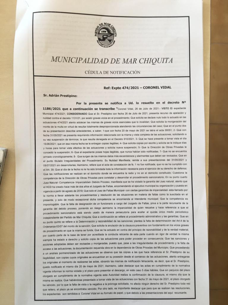 Pero el 23 de julio, mediante el Decreto 1131, se establece sanción pecuniaria, como se dijo, apenas horas después de una nueva presentación de documentación por parte de las autoridades de la radio. La multa fue apelada el 26 del mismo mes, y rechazada por el Gobierno de Jorge Paredi el último 3 de agosto. “No se explica el por qué de la acción desmedida del Intendente, ya que la documentación requerida consta efectivamente en la Dirección de Obras”, sostiene Adrián Prestipino.