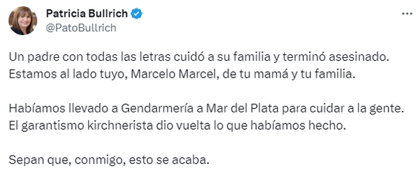 Incluso el caso tuvo repercusión a nivel nacional, no sólo en el ámbito periodístico sino también en el político. Precisamente la precandidata a presidente por Juntos x el Cambio, Patricia Bullrich, se manifestó enérgica a través de sus redes sociales.