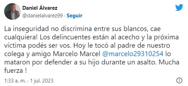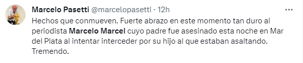 Tras conocerse anoche el asesinato de Daniel Marcel, padre del periodista Marcelo Marcel, personalidades del ámbito político y periodístico se solidarizaron y mostraron sus condolencias en redes sociales.