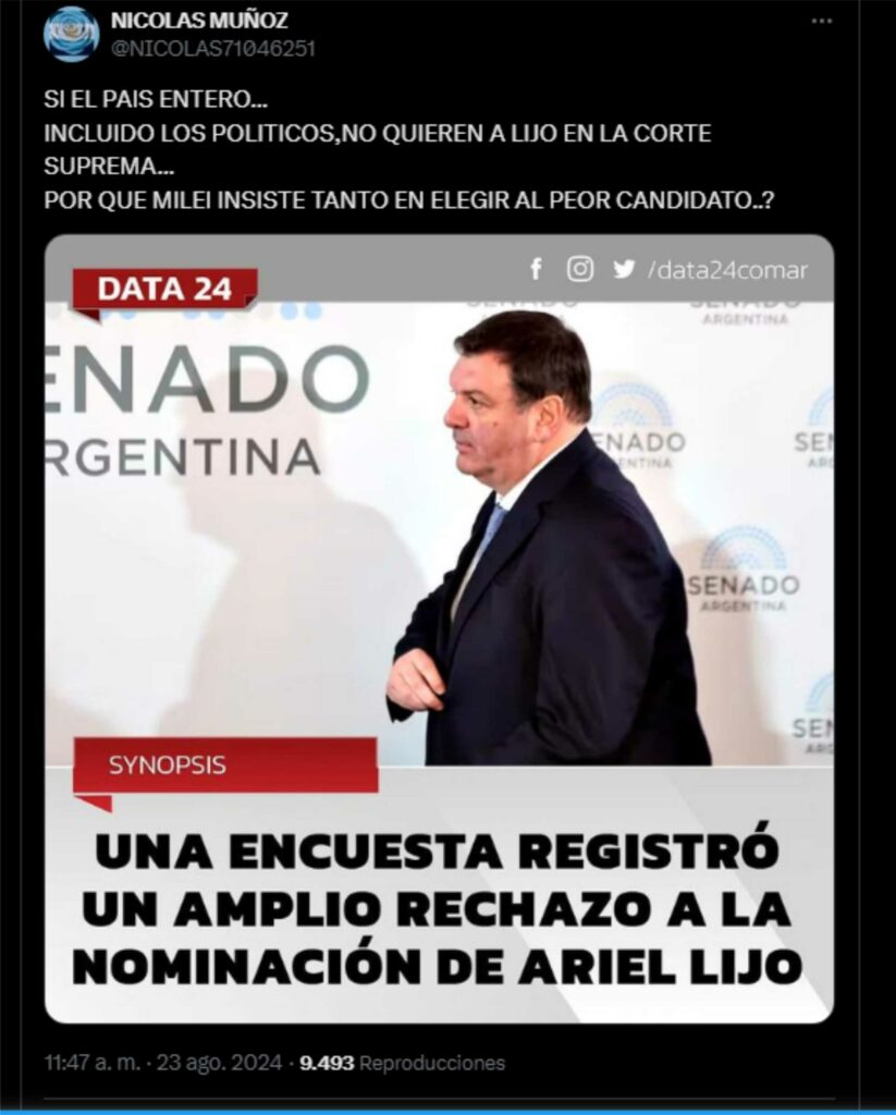 El miércoles 21 de agosto, el juez federal Ariel Lijo, en una audiencia pública, defendió su postulación para ocupar la Corte Suprema. El magistrado respondió preguntas por parte de los legisladores que integran la Comisión de Acuerdos del Senado de la Nación. La postulación de Lijo genera divisiones en la oposición y en el oficialismo.
