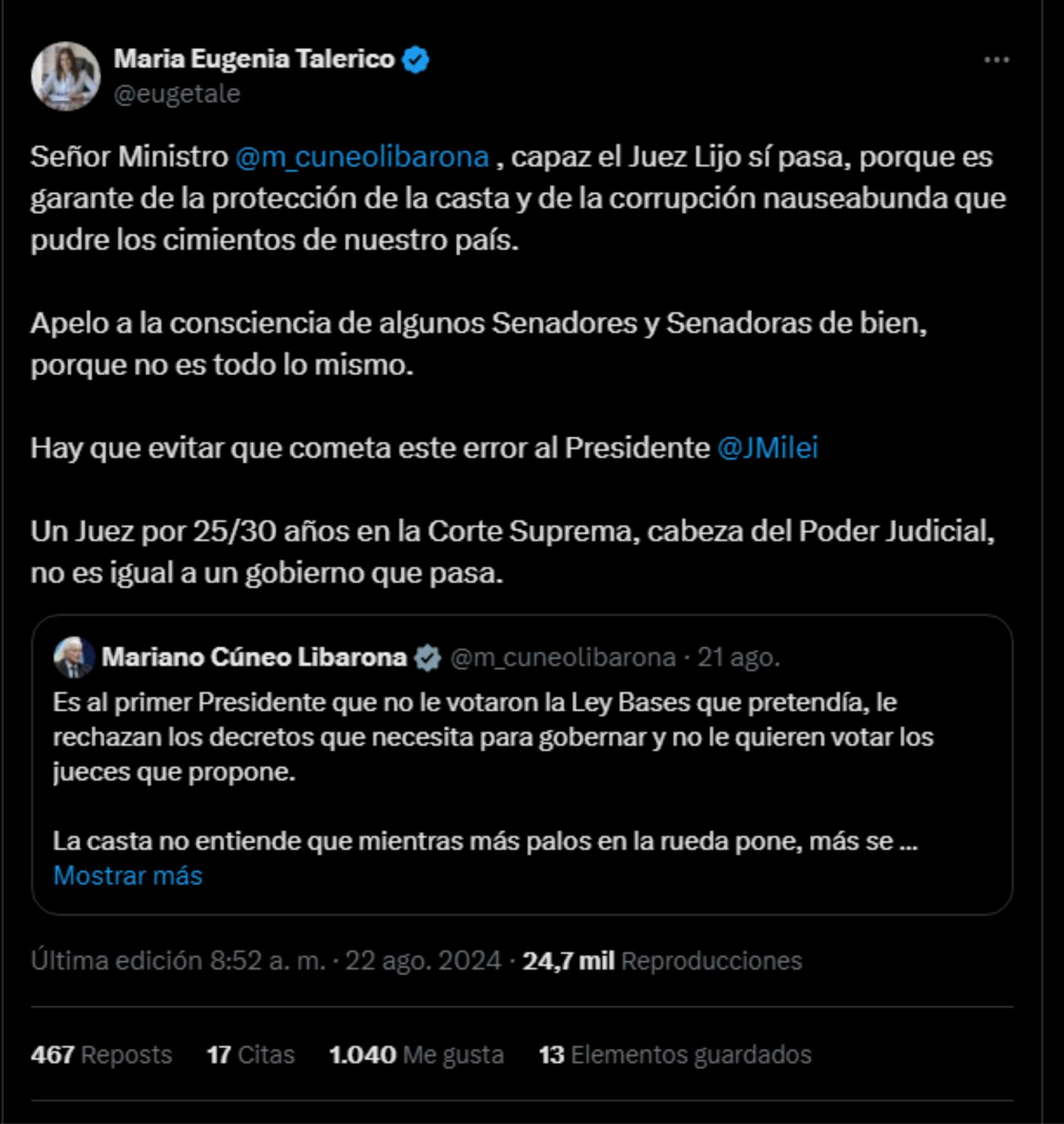 Al ser consultado por la candidatura de Lijo por un medio local, Montenegro señaló: “Hoy la Argentina tiene un problema con delitos transnacionales, con terrorismo, narcotráfico. No hay ningún juez de la Corte Suprema que haya sido penalista. Y tampoco hay ningún juez de la Corte que haya venido de la justicia que tenga la experiencia en la resolución de casos conflictivos”.