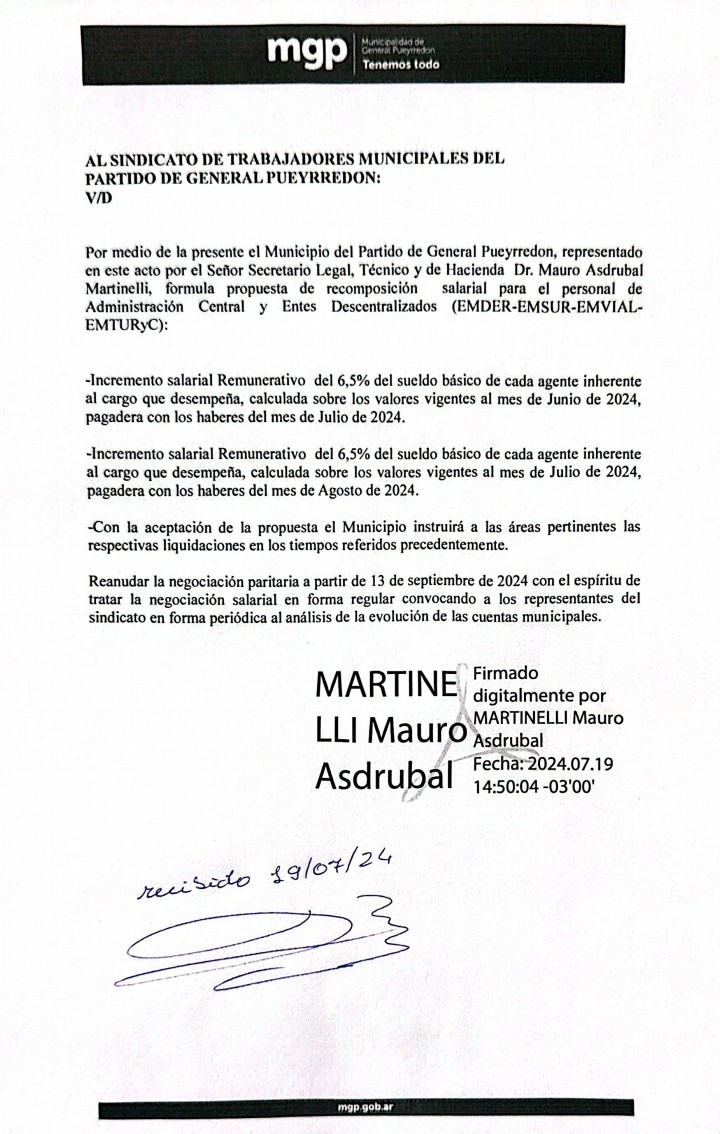 El ejecutivo municipal, según lo expresado por el secretario Martinelli, elevó a consideración de los empleados municipales una propuesta de aumento salarial que resulta alejada de los índices inflacionarios del último semestre, si tenemos en cuenta que la inflación en lo que va del 2024 ha superado el 70% y los empleados municipales solo han recibido un 10% de recomposición salarial por Decreto. Lo cual profundiza las diferencias y divergencias entre las partes.