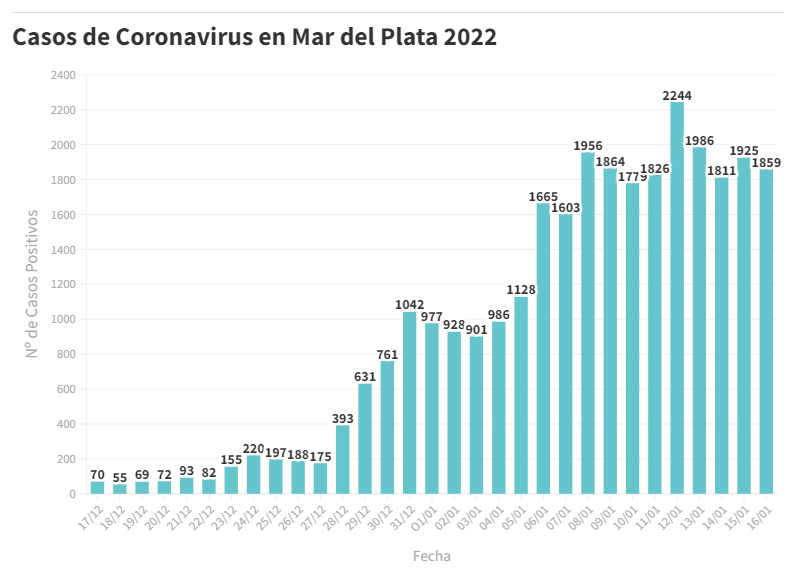 En el último informe del SISA reportado hoy se confirmaron 1.859 nuevos pacientes en tratamiento por Covid-19 en General Pueyrredon, de los cuales 10 corresponden a casos definidos por criterio clínico epidemiológico y 1.849 a estudios laboratoriales realizados desde el 3 al 15 de enero.