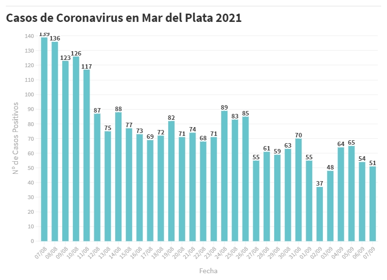 En el último informe del SISA reportado hoy se confirmaron 51 nuevos pacientes en tratamiento por Covid-19 en General Pueyrredon, de los cuales 4 corresponden a casos definidos por criterio clínico epidemiológico y 47 a estudios laboratoriales realizados desde el 28 de agosto al 6 de septiembre.