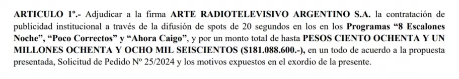«Según la resolución 29/2024 del 12 de enero del organismo, los programas de 8 Escalones Noche, Poco Correctos y Ahora Caigo de Canal 13, recibieron 181.088.600 pesos para que en esos horarios se pasen 98 spots a un costo que osciló entre los 1.331.000 y los 2.110.240 cada uno, lo que implica un costo del segundo que fue de 66.500 a 105.512.»