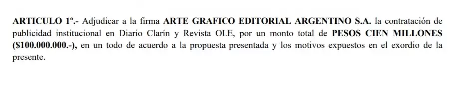 «El grupo Clarín es uno de los grupos mediáticos más beneficiados por el municipio que dirige el ex ministro de Justicia y Seguridad porteño. En la resolución 49/2024 del 17 de enero, el EmturyC le dio 100.000.000 de pesos en concepto de pauta para los diarios Clarín y, el especializado en deportes, Olé. También la señal de cable TN recibió, según la resolución 80/2024, el monto de 38.889.400.»