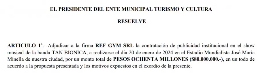 «Uno de los gastos más notorios que reveló la investigación fue una pauta publicitaria que recibió Tan Biónica en el show que brindó en el Estadio Mundialista de Mar del Plata realizado el 20 de enero, un espacio que gestiona el distrito que conduce Montenegro. Allí le ofrecieron 80 millones de pesos para que aparezca el logo del municipio en los materiales de difusión que se realizaron del evento, además de en un spot previo al concierto».