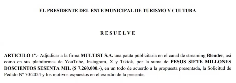 Por último la investigación expuso en la resolución 65/2024 una pauta de 7.260.000 pesos para el canal de streaming Blender, medio que cubrió un especial desde el boliche Mute, en cual, al igual que en el programa de la diva de los almuerzos, participó el intendente Montenegro».