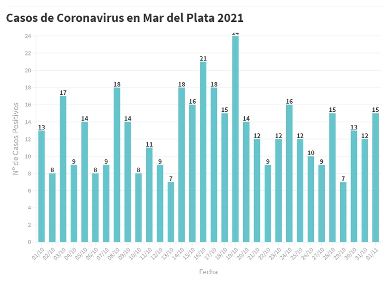 En el último informe del SISA reportado este lunes se confirmaron 15 nuevos pacientes en tratamiento por Covid-19 en General Pueyrredon, de los cuales 2 corresponden a casos definidos por criterio clínico epidemiológico y 13 a estudios laboratoriales realizados desde el 23 al 31 de octubre.