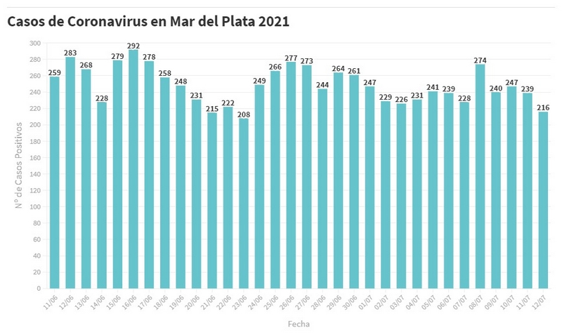 En el último informe del SISA presentado hoy, se confirmaron 216 nuevos pacientes en tratamiento por Covid-19 en Mar del Plata, de los cuales 19 corresponden a casos definidos por criterio clínico epidemiológico y 197 estudios laboratoriales realizados desde el 28 de junio al 11 de julio.