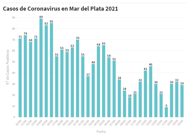 En el último informe del SISA reportado hoy se confirmaron 29 nuevos pacientes en tratamiento por Covid-19 en General Pueyrredon, de los cuales 4 corresponden a casos definidos por criterio clínico epidemiológico y 25 estudios laboratoriales realizados desde el 16 al 19 de septiembre.