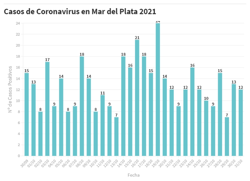 En el último informe del SISA reportado hoy se confirmaron 12 nuevos pacientes en tratamiento por Covid-19 en General Pueyrredon, de los cuales uno corresponde a un caso definido por criterio clínico epidemiológico y 11 a estudios laboratoriales realizados desde el 18 al 30 de octubre.