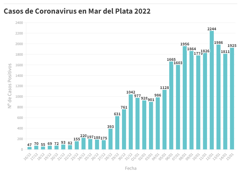 En el último informe del SISA reportado hoy se confirmaron 1925 nuevos pacientes en tratamiento por Covid-19 en General Pueyrredon, de los cuales 7 corresponden a casos definidos por criterio clínico epidemiológico y 1918 a estudios laboratoriales realizados desde el 3 al 14 de enero.