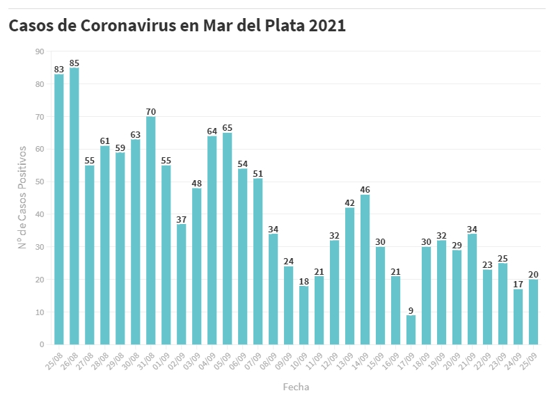 En el último informe del SISA reportado hoy se confirmaron 20 nuevos pacientes en tratamiento por Covid-19 en General Pueyrredon, de los cuales 5 corresponden a casos definidos por criterio clínico epidemiológico y 15 estudios laboratoriales realizados desde el 20 al 24 de septiembre.