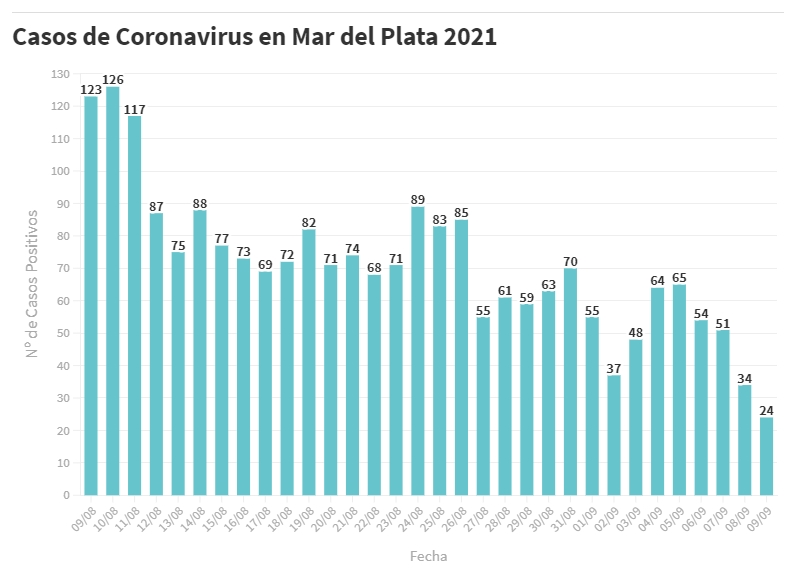 En el último informe del SISA reportado hoy se confirmaron 24 nuevos pacientes en tratamiento por Covid-19 en General Pueyrredon, de los cuales 2 corresponden a casos definidos por criterio clínico epidemiológico y 22 a estudios laboratoriales realizados desde el 6 al 9 de septiembre.