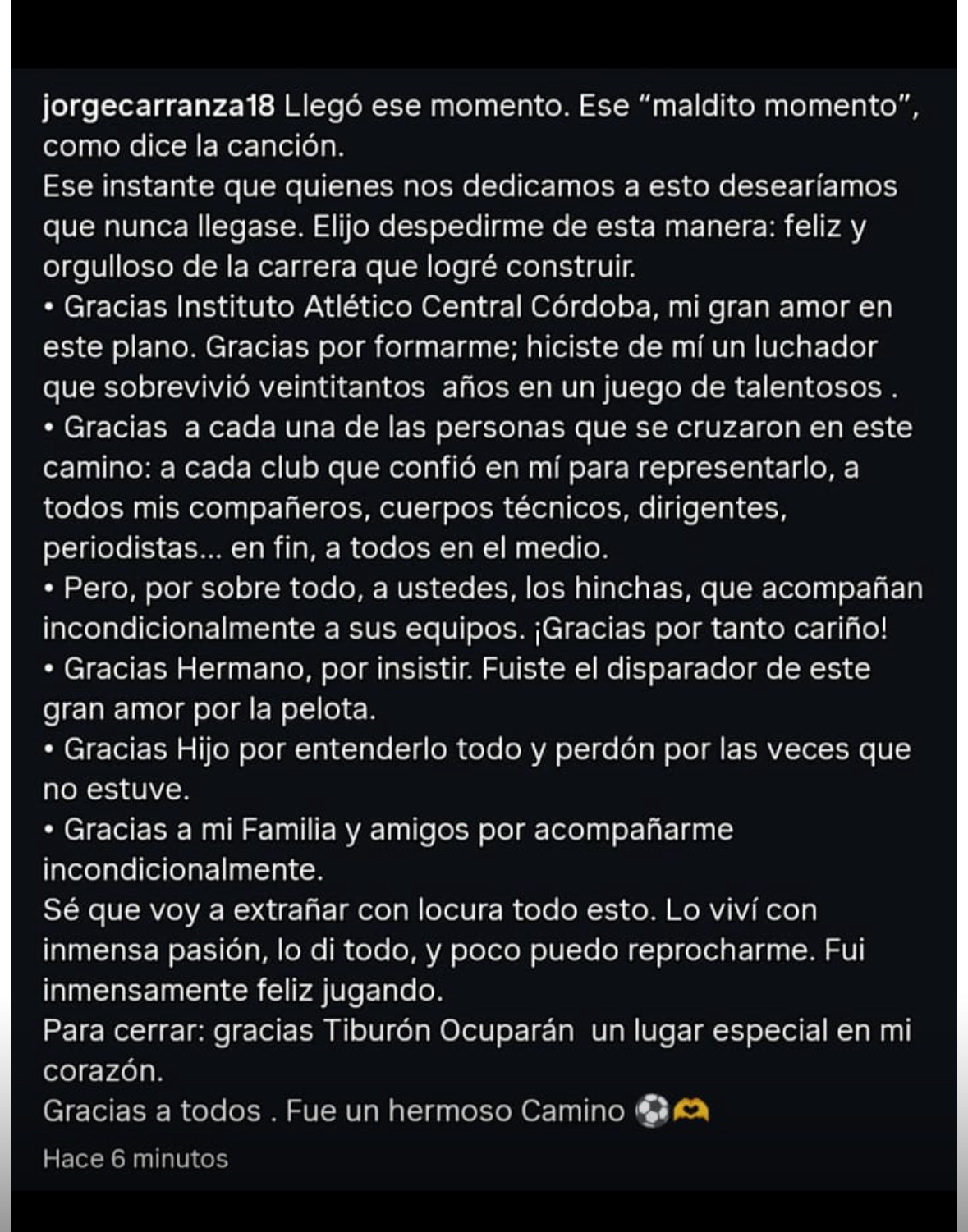 Si bien es cierto que hace un par de semanas el DT de Aldosivi Guillermo Farré le aseguró a “La Voz Del Estadio “ radio y streaming que Carranza será uno de los 3 arqueros en 2026 , este 26 de noviembre apareció el posteo del arquero de 44 años de edad anunciando su retiro .