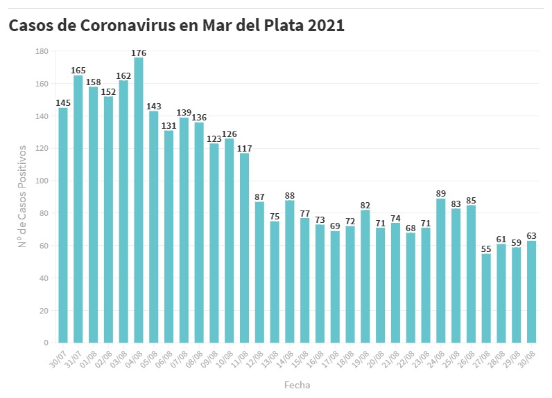 En el último informe del SISA reportado hoy se confirmaron 63 nuevos pacientes en tratamiento por Covid-19 en General Pueyrredon, de los cuales 8 corresponden a casos definidos por criterio clínico epidemiológico y 55 a estudios laboratoriales realizados desde el 16 al 29 de agosto.