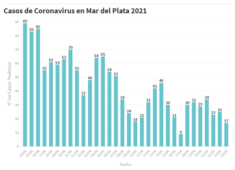 En el último informe del SISA reportado hoy se confirmaron 17 nuevos pacientes en tratamiento por Covid-19 en General Pueyrredon, de los cuales 2 corresponden a casos definidos por criterio clínico epidemiológico y 15 a estudios laboratoriales realizados desde el 19 al 23 de septiembre.
