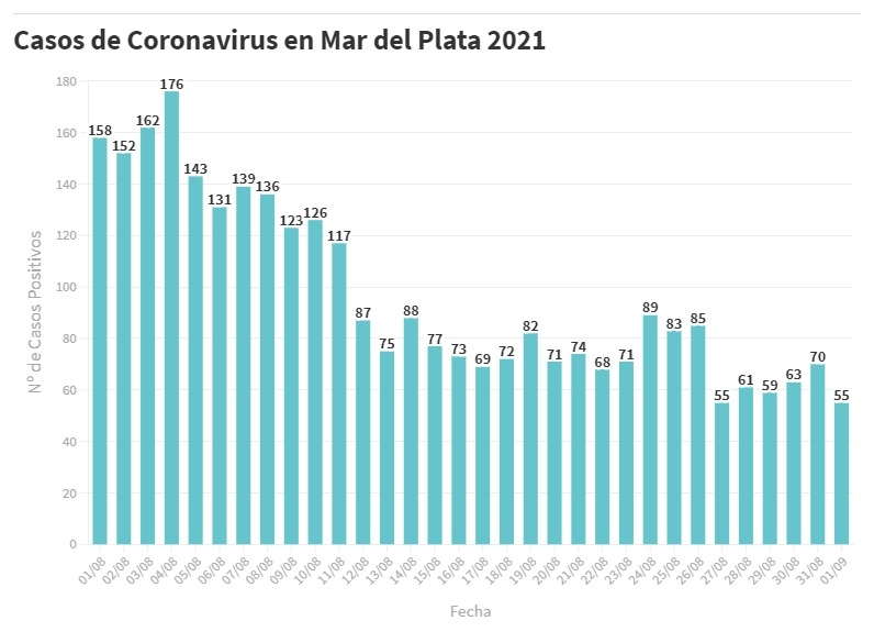 En el último informe del SISA reportado hoy se confirmaron 55 nuevos pacientes en tratamiento por Covid-19 en General Pueyrredon, que corresponden a casos definidos por estudios laboratoriales realizados desde el 26 al 31 de agosto.