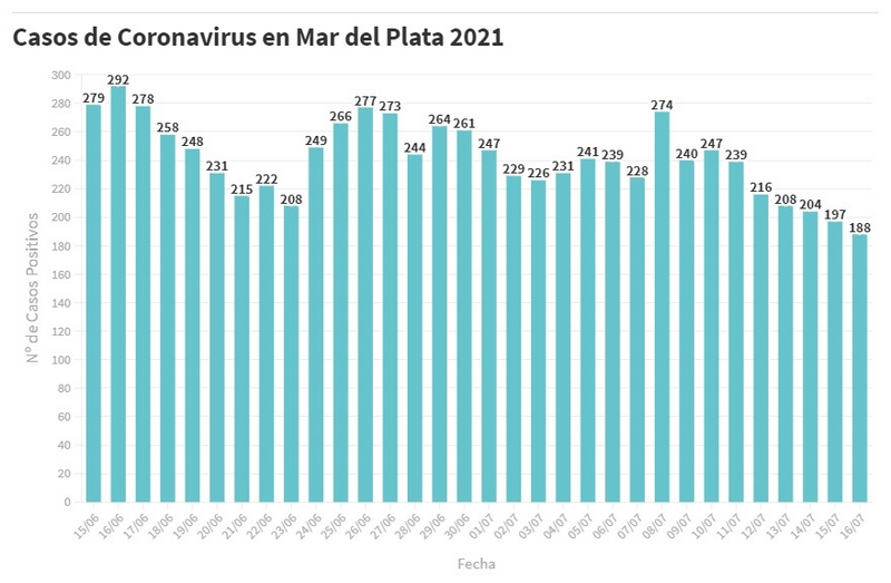 Por sexto día consecutivo los casos de Covid-19 bajaron en Mar del Plata. En el último informe del SISA, se confirmaron 188 nuevos pacientes en tratamiento por Covid-19, de los cuales 21 corresponden a casos definidos por criterio clínico epidemiológico y 167 estudios laboratoriales realizados desde el 5 al 15 de julio.