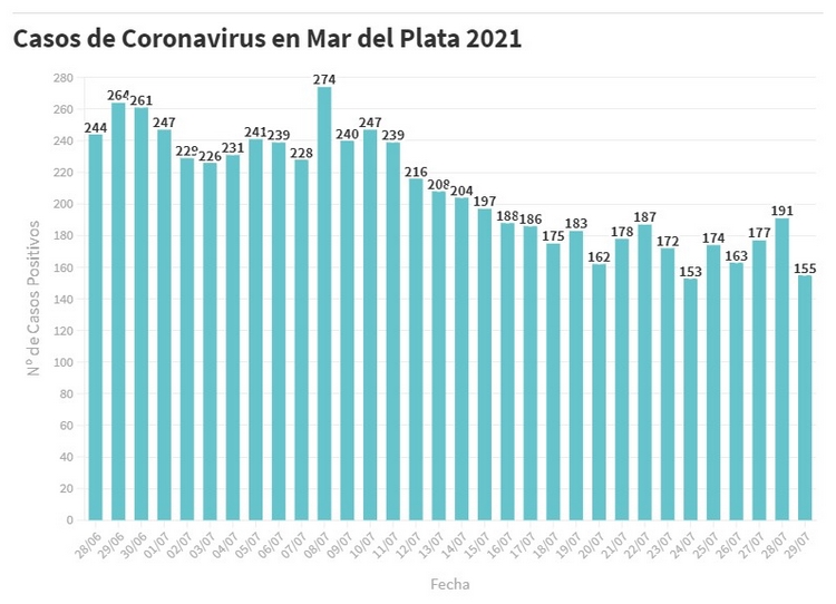 En el último informe del SISA reportado hoy se confirmaron 155 nuevos pacientes en tratamiento por Covid-19 en General Pueyrredon, de los cuales 16 corresponden a casos definidos por criterio clínico epidemiológico y 139 a estudios laboratoriales realizados desde el 19 al 28 de julio.