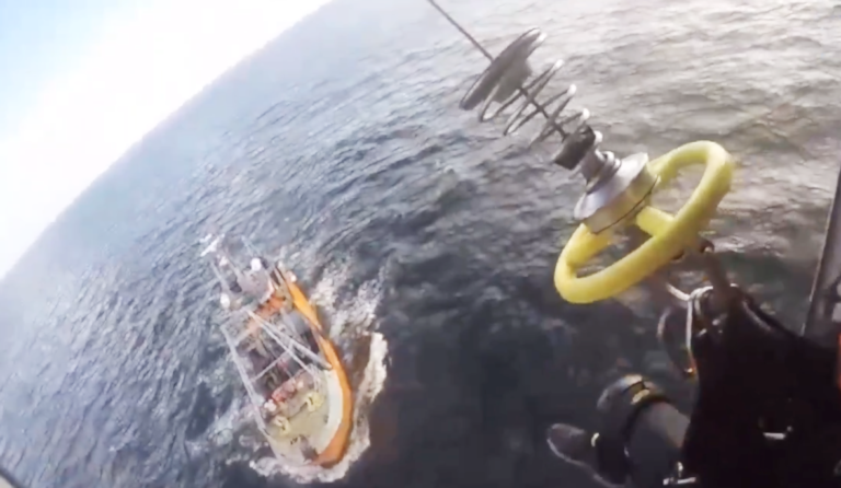 En una maniobra súper precisa, el helicóptero llegó al área marítima, se posicionó sobre el joven herido, hizo descender una canasta de rescate en la que ingresó el marinero y, con el cuidado requerido, los tripulantes lo elevaron.