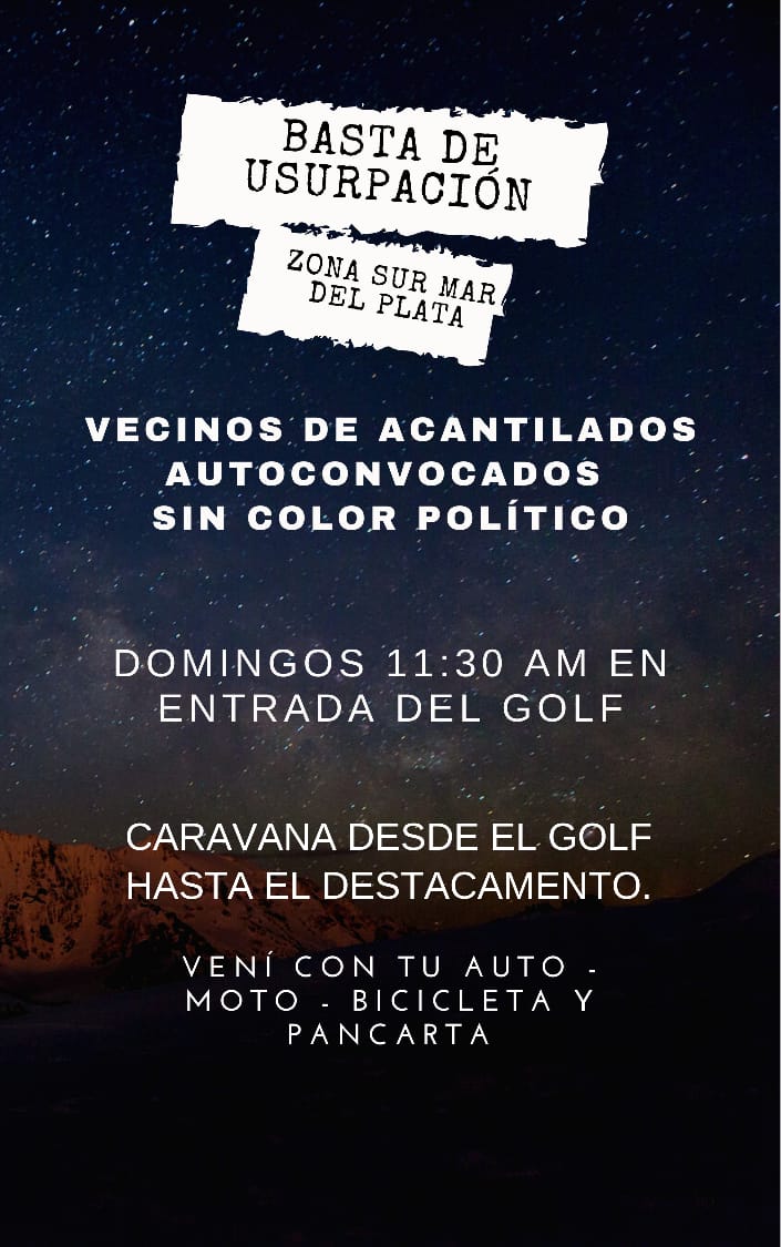 Según manifiestan hay una movilización vecinal para detener la toma ilegal de terrenos en toda la zona Sur de Mar del Plata, y agregan que “estas tomas de terrenos están organizadas por abogados, agrimensores y vecinos quienes se creen dueños de lo ajeno, mientras que la policía mira para otro lado”, según manifestó Celeste una vocera de los vecinos que reclaman la ayuda de las autoridades pertinentes.